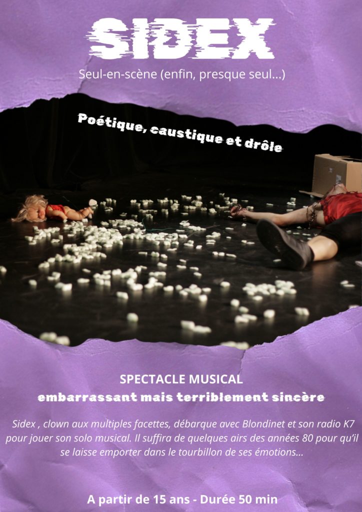 Dans ce seul-en-scène burlesque, grinçant et musical on s'amuse des peurs, des codes, des étiquettes, et l'on ose aborder non-dits, tabous, et poids du regard de l'autre dans l'affirmation de soi. Tout ça avec la liberté permise par SIDEX, ce clown tendre et rugueux à la fois.